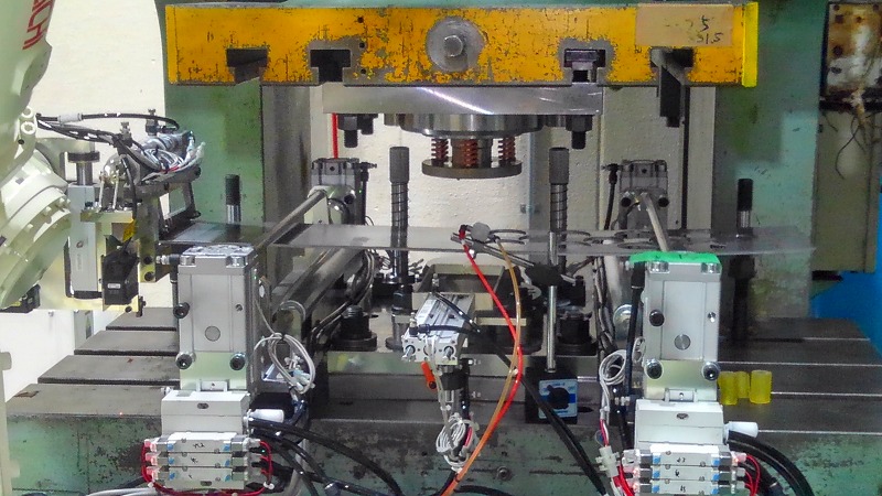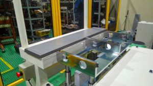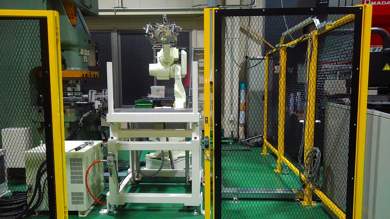 板状のワークを一枚ずつ切り出し、プレス機へハンドリング゛し自動でプレス加工を行うシステムです。