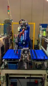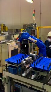 HOME > YMY ROBO BASEとは > 円筒研削盤ローディング装置 円筒研削盤ローディング装置 2台の円筒研削盤の間のロボットがシャフト状のワークを自動でローディング、アンローディング、検査を行うシステムです。 | 一覧に戻る |